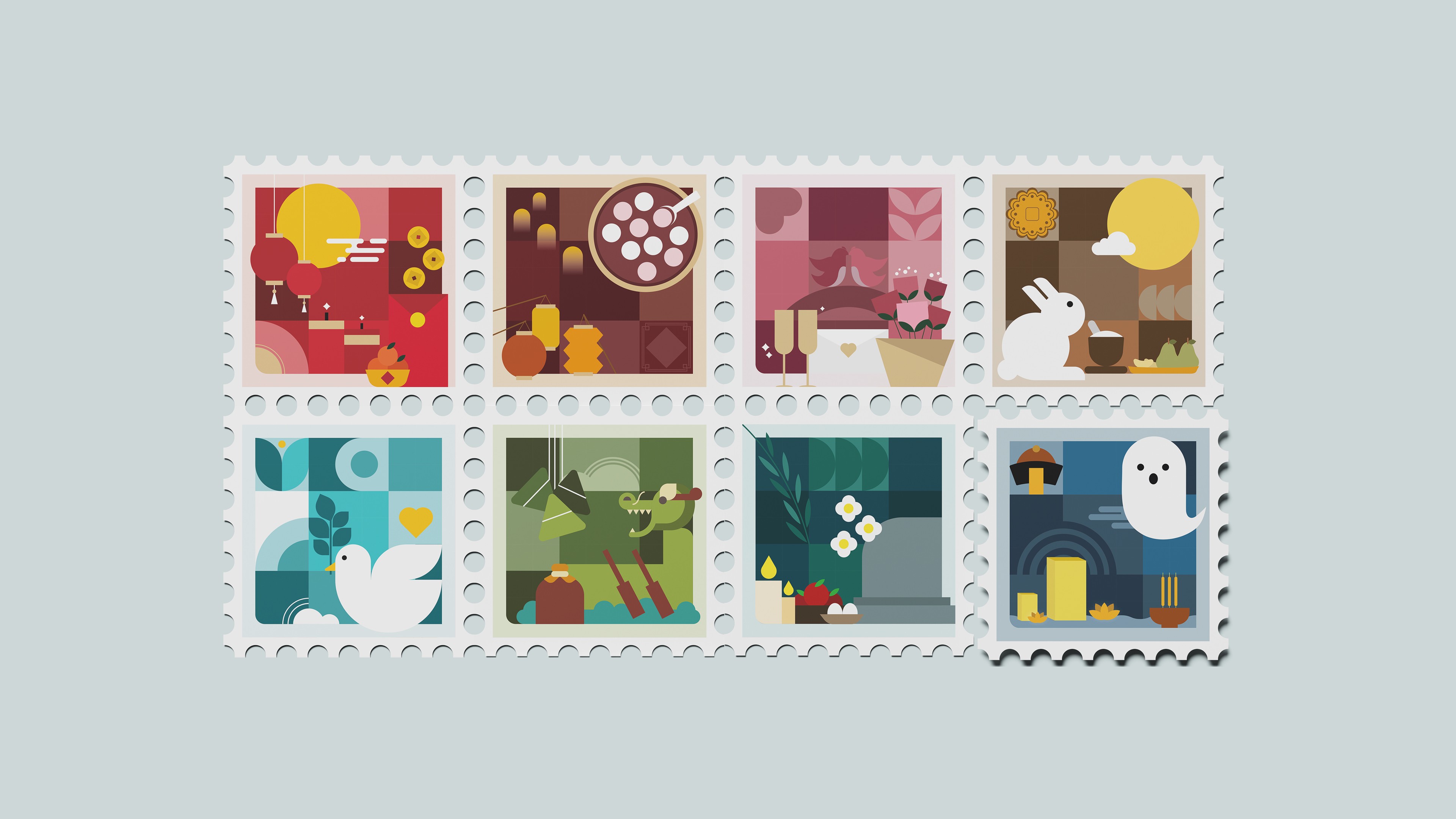 ➝ A commemorative stamp series that translates Taiwanese festivals into a unified geometric visual language.