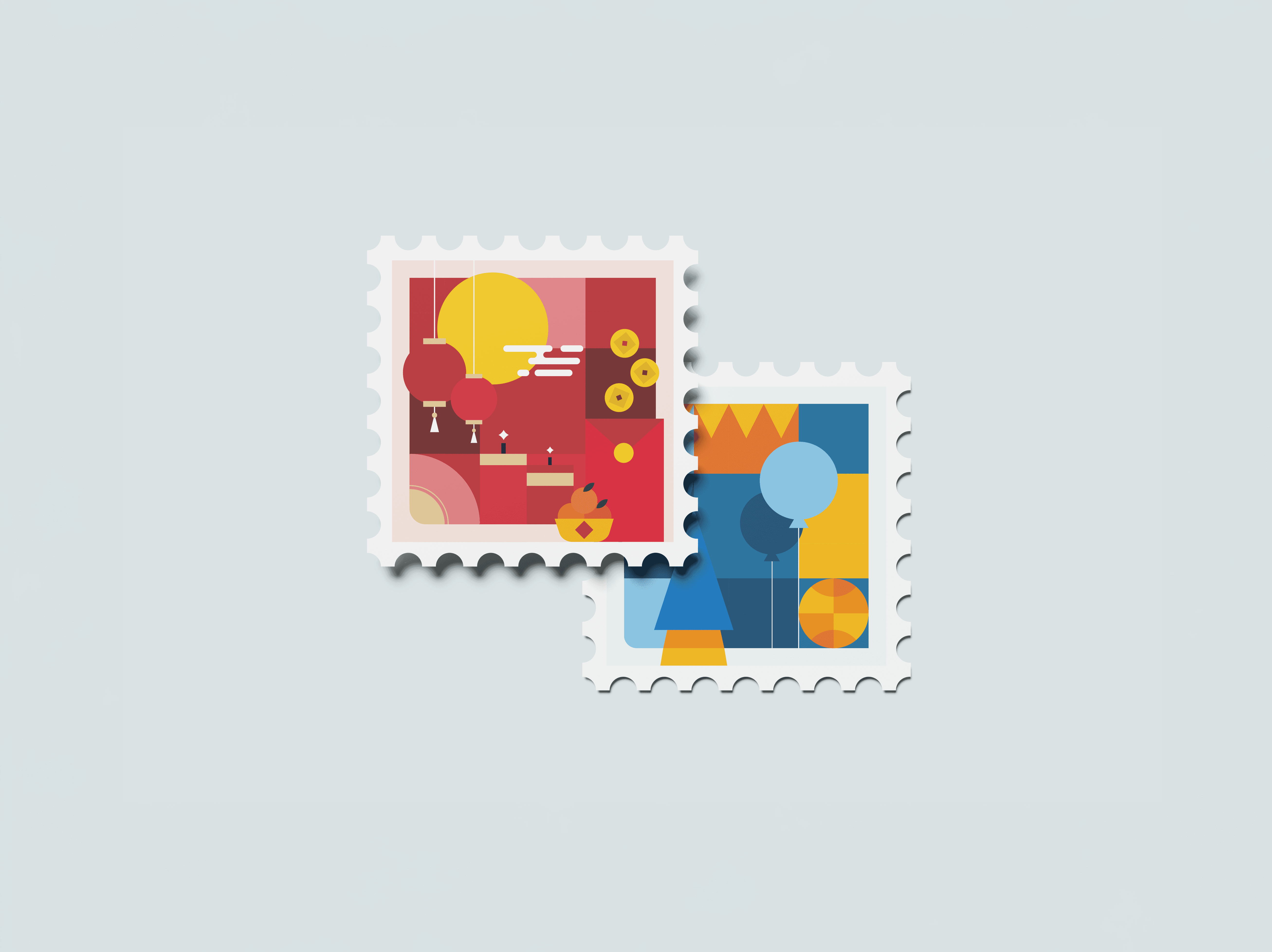 This project explores how geometric illustration can serve as a visual system for cultural storytelling. Inspired by Taiwanese festivals, each stamp interprets a ritual moment through simplified forms, symbolic objects, and a shared compositional grid. While every festival maintains its own color and imagery, all stamps remain connected through consistent geometry and visual rhythm. Designed as a commemorative stamp, the series transforms everyday cultural practices into collectible artifacts—promoting Taiwan not through landmarks or slogans, but through lived traditions and shared memory.